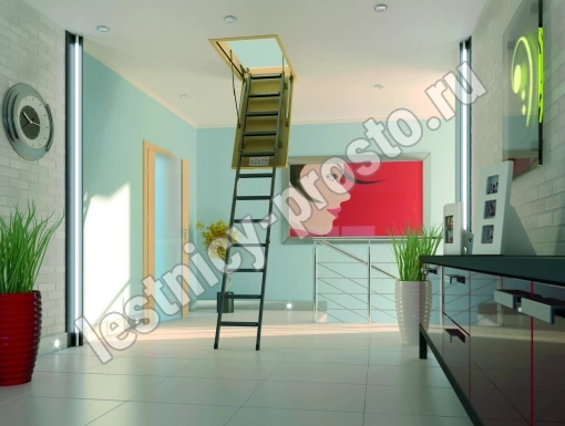 Установленные в лестнице угловые петли-шарниры нового образца придают ей высокую прочность и надежность, а также предохраняют короб от возможной деформации. Основное преимущество чердачной складной металлической лестницы LMS сводится к ее небольшим габаритам при сохранении высокой функциональности, прочности, надежности и эстетичности конструкции. Монтировать лестницу очень просто, для этого не придется затрачивать много времени и сил.