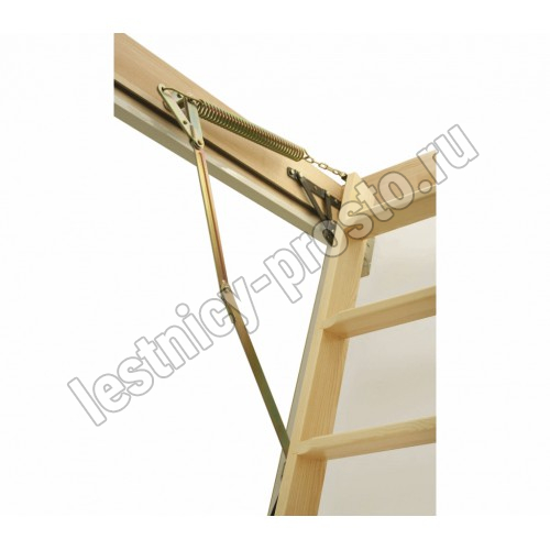 Чердачная лестница LTK Thermo изготовлена из сосны высшего качества и укомплектована утепленной крышкой люка толщиной 66 мм с повышенными теплоизоляционными свойствами. Данную модель лестницы можно использовать даже в домах, где значительна разница температур между этажами, и тем самым ограничить проникновение холода в жилые помещения. Лестница состоит из трех секций, которые компактно складываются и «хранятся в потолке». Крышка люка облицована ДВП белого цвета, что делает ее практически незаметной при установке в светлом или белом потолке. Для большего удобства и безопасности эксплуатации лестница Thermo оснащена боковым металлическим поручнем, а пластиковые наконечники предохраняют поверхность пола от повреждения и увеличивают устойчивость конструкции
