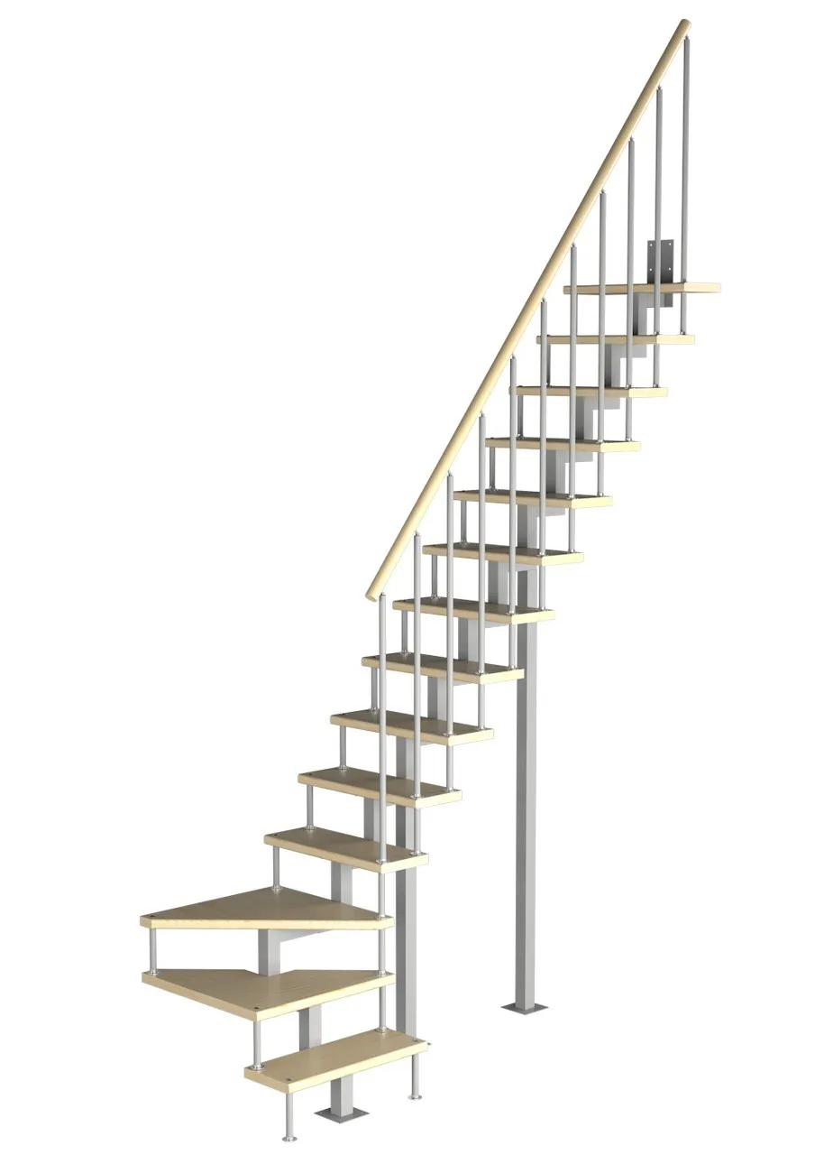 Удобная поворотная лестница на второй этаж. Дополнительные ограждения по первому маршу обеспечивают безопасность при подъеме и спуске, кроме того, небольшой угол подъема открывает всю площадь ступеней. Монтаж осуществляется силами двух человек на объекте по указаниям, приведенным в паспорте на лестницу.