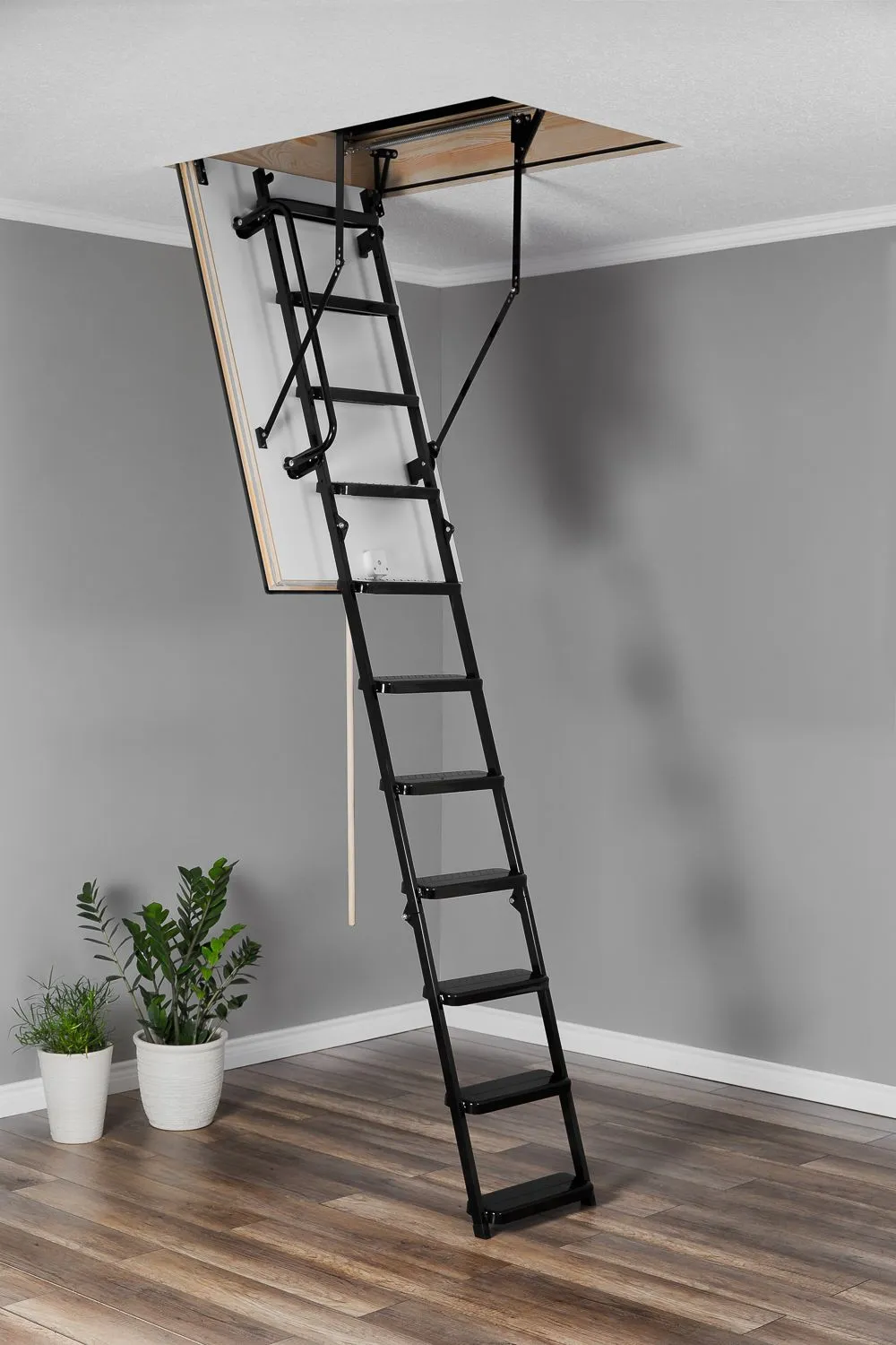 Рекомендуем модель для организации подъема на мансардный этаж в двухуровневую квартиру или на дачу, в мастерскую, как способ подняться на чердак или спуститься в подвал, у этой лестницы подходящие для этих задач особенности: