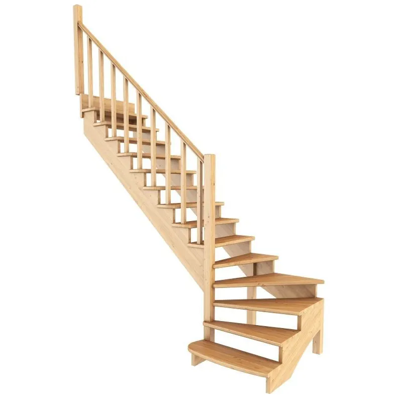 Классическая деревянная лестница с удобным забежным поворотом. Лестница без какого-либо покрытия. В комплекте элементы лестницы и ограждения в разобранном виде, необходимый крепеж, инструкция по сборке.