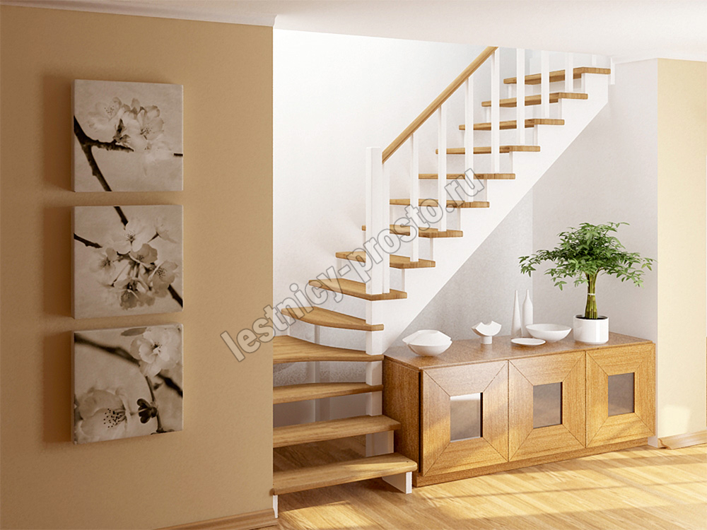 Ступени и поручень лестинцы изготовлены из бука, остальные элементы из сосны. Возможно изготовление данной модели полностью из бука. Базовый комплект включает в себя деревянные элементы лестницы и ограждения без какого-либо покрытия.