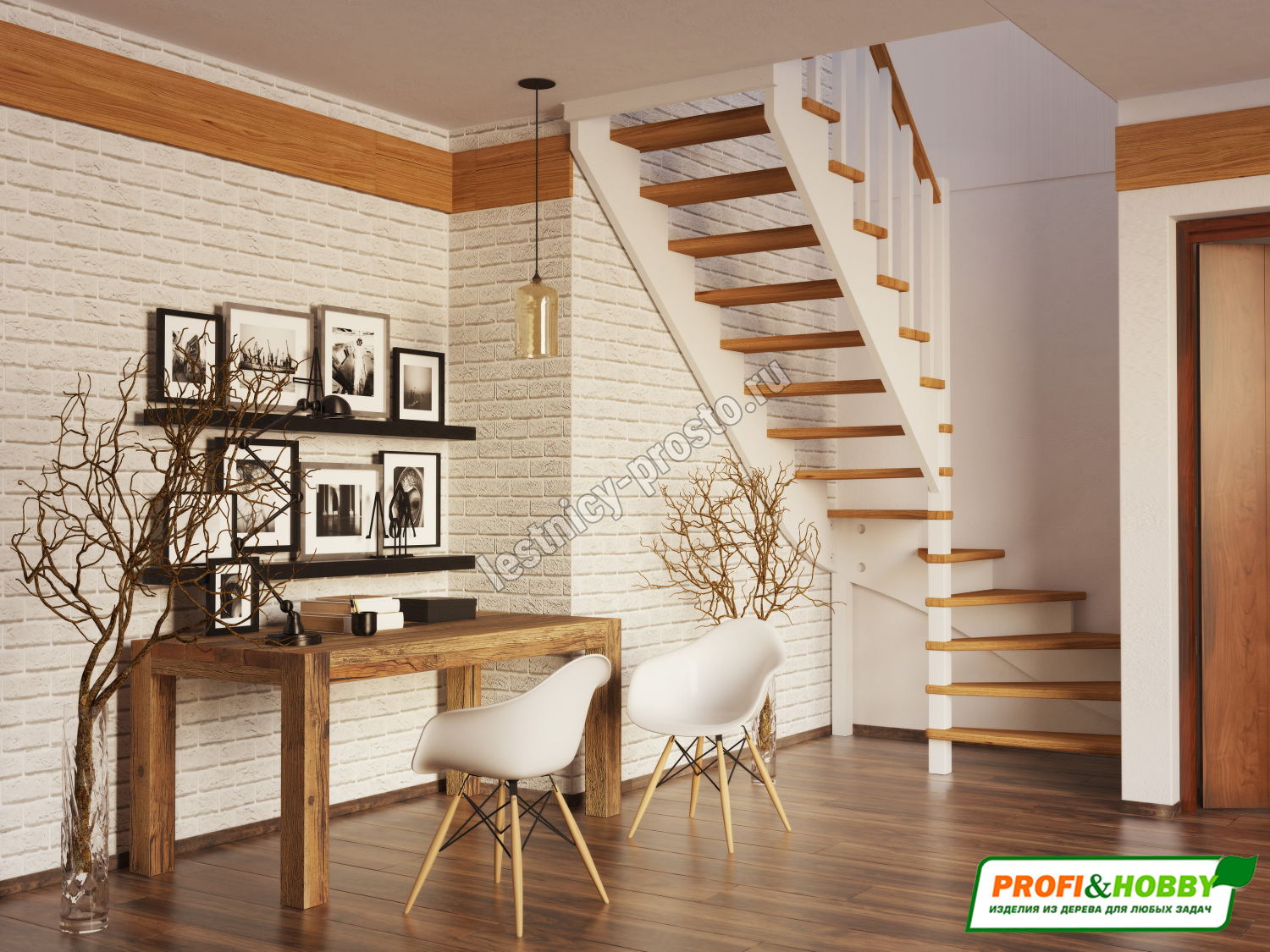 Ступени и поручень лестницы изготовлены из сращенного дуба; тетивы, столбы, балясины - из сосны. Возможно изготовление данной модели полностью из дуба. Базовый комплект включает в себя деревянные элементы лестницы и ограждения без какого-либо покрытия.