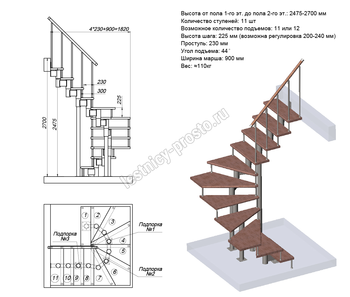 Высота лестницы 2475 - 2700 (11 ступеней) мм