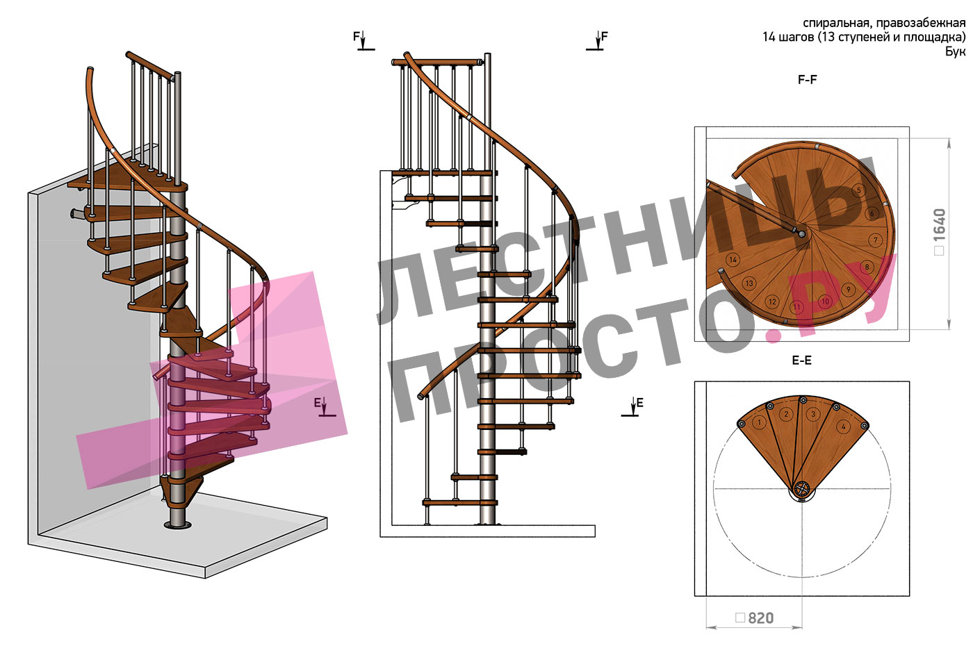 | Винтовая лестница Prosto Spiral Black D140см, h282.2-326,3 см, бук |