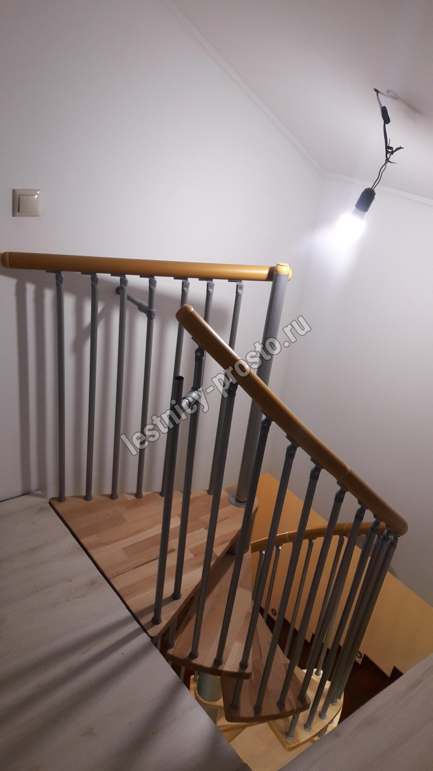 Поручень изготовлен из массива дуба в тон ступеням. Поручень и ступени лестницы покрыты износостойким защитным лаком.