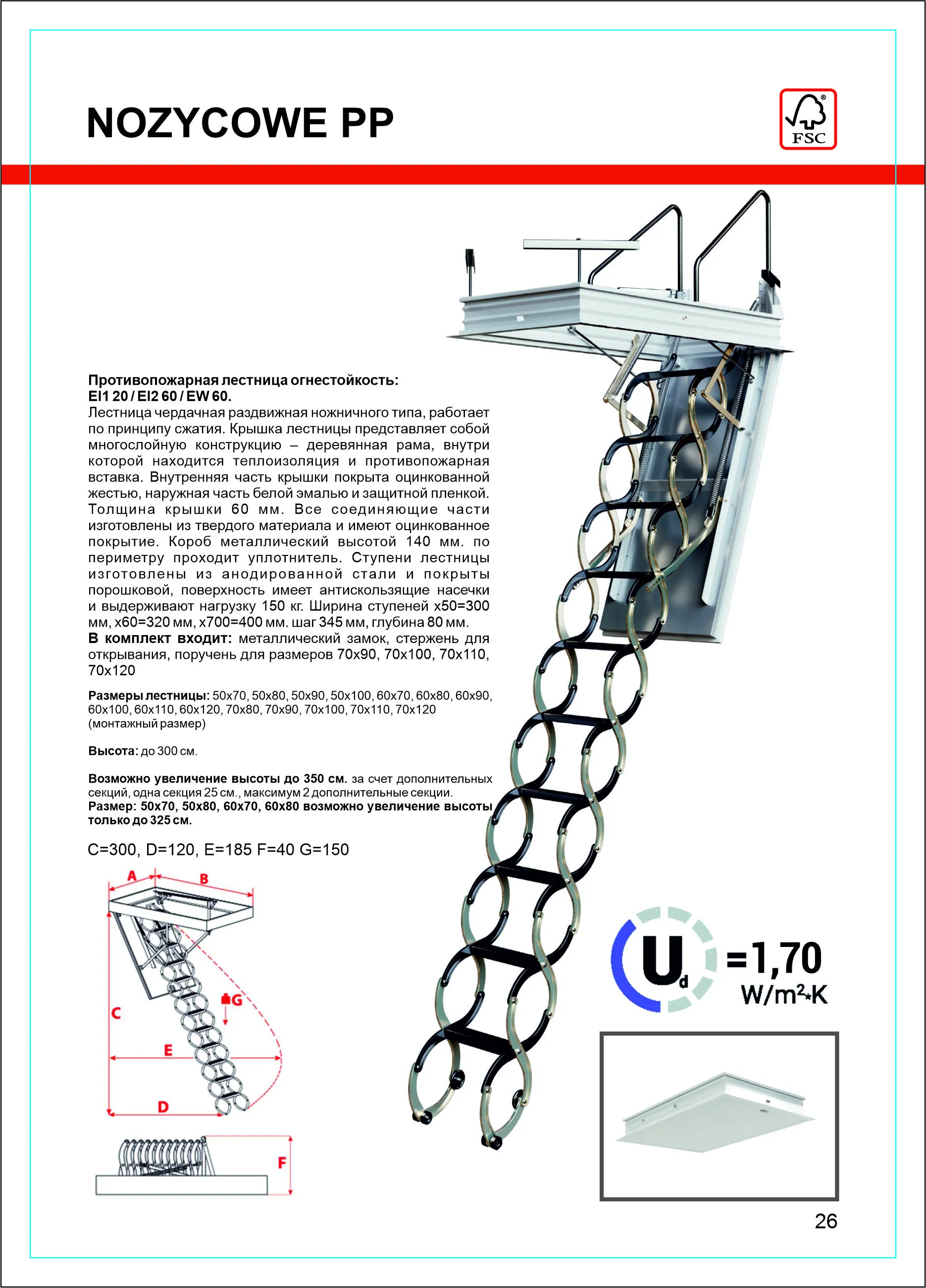 Лестница представлена в двух вариантах: с поворотом направо и с поворотом налево. Благодаря возможности регулировать высоту шага с помощью пластиковых вставок (входят в базовый комплект), высоту лестницы можно варьировать в пределах от 2860 до 3090 мм. Кроме того, купив дополнительную секцию для этой лестницы, можно поднять высоту до 3320 мм.